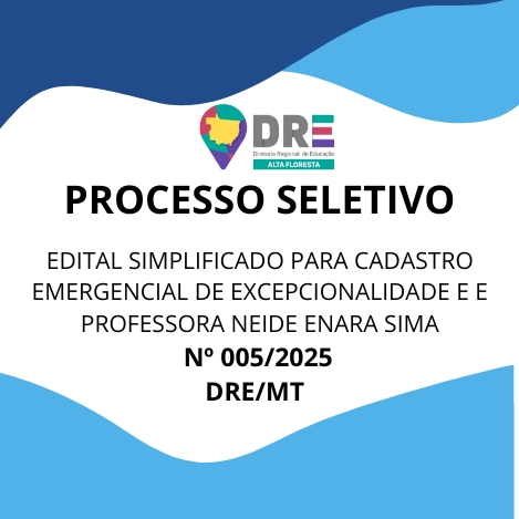 O(A) DIRETOR (A) DA DIRETORIA REGIONAL DE EDUCAÇÃO DE ALTA FLORESTA MT, no uso de suas atribuições legais, torna pública a abertura de inscrições para seleção de profissionais da Rede Estadual de Ensino de Mato Grosso, na conformidade da Instrução Normativa Nº 012/2024/SEDUC/MT e da Portaria N° 1.138/2024/GS/SEDUC/MT, para o cargo de Professor da Educação Básica para lecionar na Sala de Recursos Multifuncionais e Intérprete de Libras. Conforme necessidade.