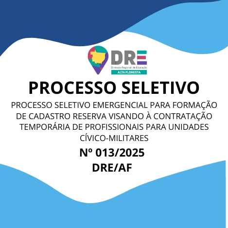 A DIRETORIA REGIONAL DE EDUCAÇÃO, no uso de suas atribuições legais, torna público o chamamento para composição do Cadastro Emergencial para contratação temporária para o cargo de cadastro reserva para contratação temporária nas funções de (a) Apoio Técnico Especializado Cívico-Militar Nível 01, (b) Apoio Técnico Especializado Cívico-Militar Nível 02 e (c) Inspetor Cívico-Militar-Nível Suporte e Apoio para atender as Escolas Estaduais participantes do Programa Escolas Estaduais Cívico-Militares do Estado de Mato Grosso, no âmbito das Diretorias Regionais de Ensino de Mato Grosso- DRE. As inscrições foram prorrogadas até às 23:59m do dia 01/08/2025, somente através do site eletrônico da Diretoria Regional de Educação – DRE: https://drealtafloresta.com.br/drealtafloresta/, através do formulário https://forms.gle/eotj61i7SUqkQnLVA