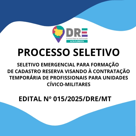 A DIRETORIA REGIONAL DE EDUCAÇÃO, no uso de suas atribuições legais, torna público o chamamento para composição do Cadastro Emergencial para contratação temporária para o cargo de cadastro reserva para contratação temporária nas funções de (a) Apoio Técnico Especializado Cívico-Militar Nível 01, (b) Apoio Técnico Especializado Cívico-Militar Nível 02 e (c) Inspetor Cívico-Militar-Nível Suporte e Apoio para atender as Escolas Estaduais participantes do Programa Escolas Estaduais Cívico-Militares do Estado de Mato Grosso, no âmbito das Diretorias Regionais de Ensino de Mato Grosso- DRE. Inscrições abertas do dia 25/10/2025 até as 18h do dia 04/11/2025, somente através do site eletrônico da Diretoria Regional de Educação – DRE: https://drealtafloresta.com.br/drealtafloresta/, através do formulário https://forms.gle/bMhG8q2u6XsKZ4a98