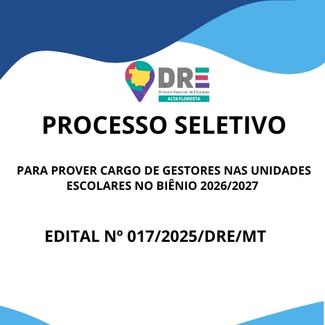 O DIRETOR DA DIRETORIA REGIONAL DE EDUCAÇÃO DE ALTA FLORESTA, no uso de suas atribuições legais, e, considerando o que dispõe a Lei Complementar nº 50 de 01/10/98, Lei Complementar nº 04 de 15/10/90, o Decreto nº 1497 de 10/10/2022, a Lei Complementar nº 756 de 14/02/2023 e o Decreto nº 256 de 05/05/2023, torna públicas, por meio deste EDITAL COMPLEMENTAR de SELEÇÃO, as normas e instruções para a realização de Processo Seletivo – PSS/2024, destinadas à seleção de servidores para exercerem o cargo de Diretor (a) de Unidade e Coordenador (a) Pedagógico para Biênio 2026/2027 nos termos do EDITAL Nº 011/2023/GS/SEDUC/MT. As inscrições ocorrerão a partir do dia 29/12/2025 até às 23:59h do dia 05/01/2026, somente através do site eletrônico da Diretoria Regional de Educação – DRE: https://drealtafloresta.com.br/drealtafloresta/ através do formulário: https://forms.gle/GV6mnnAVsq7Vy2BZ9