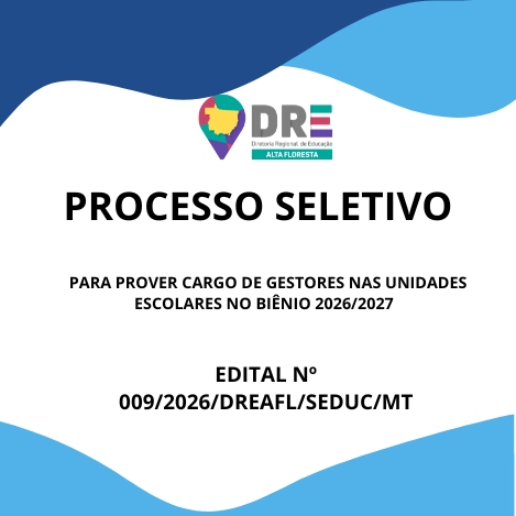 O DIRETOR DA DIRETORIA REGIONAL DE EDUCAÇÃO DE ALTA FLORESTA, no uso de suas atribuições legais, e, considerando o que dispõe a Lei Complementar nº 50 de 01/10/98, Lei Complementar nº 04 de 15/10/90, o Decreto nº 1497 de 10/10/2022, a Lei Complementar nº 756 de 14/02/2023 e o Decreto nº 256 de 05/05/2023, torna públicas, por meio deste EDITAL COMPLEMENTAR de SELEÇÃO, as normas e instruções para a realização de Processo Seletivo – PSS/2024, destinadas à seleção de servidores para exercerem o cargo de Diretor (a) de Unidade e Coordenador (a) Pedagógico para Biênio 2026/2027 nos termos do EDITAL Nº 11/2023/GS/SEDUC/MT. As inscrições ocorrerão a partir do dia 03/02/2026 até às 23:59h do dia 08/02/2026, somente através do site eletrônico da Diretoria Regional de Educação – DRE: https://drealtafloresta.com.br/drealtafloresta/ através do formulário: https://forms.gle/QvnfquE24PB7icAg8
