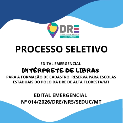 A DIRETORIA REGIONAL DE EDUCAÇÃO, MUNICÍPIO DE ALTA FLORESTA/MT, no uso de suas atribuições legais, considerando a Lei Complementar nº 04 de 15 de outubro de 1990, a Lei Complementar nº 50 de 1° de outubro de 1998, e a necessidade de recompor o quadro de servidores para substituições aos afastamentos legais no município de ALTA FLORESTA/MT, torna público o presente Edital Emergencial, que estabelece as normas e instruções para a realização de Processo Seletivo Simplificado – PSS, destinado à formação de cadastro de reserva para contratação temporária, por tempo determinado, para o cargo de INTERPRETE DE LIBRAS. As inscrições ocorrerão nos dia 18/03/2026 a 24/03/2026, somente através do site eletrônico da Diretoria Regional de Educação – DRE: https://drealtafloresta.com.br/drealtafloresta/ através do formulário: https://forms.gle/9r3HP6W3A27P2F1M8