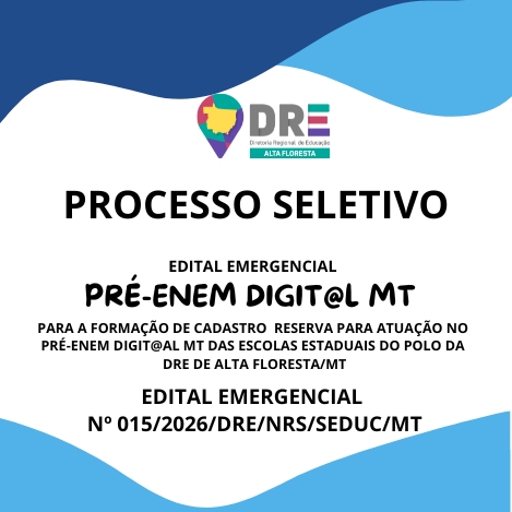 A DIRETORIA REGIONAL DE EDUCAÇÃO, MUNICÍPIO DE ALTA FLORESTA/MT, no uso de suas atribuições legais, considerando a Lei Complementar nº 04 de 15 de outubro de 1990, a Lei Complementar nº 50 de 1° de outubro de 1998, e a necessidade de recompor o quadro de servidores para substituições aos afastamentos legais no município de ALTA FLORESTA/MT, torna público o presente Edital Emergencial, que estabelece as normas e instruções para a realização de Processo Seletivo Simplificado – PSS, destinado à formação de cadastro de reserva para contratação temporária, por tempo determinado, para PROFESSOR PRÉ-ENEM 10H. As inscrições ocorrerão nos dia 30/03/2026 a 02/04/2026, somente através do site eletrônico da Diretoria Regional de Educação – DRE: https://drealtafloresta.com.br/drealtafloresta/ através do formulário: https://forms.gle/e1nEZTjK8dTF45829
