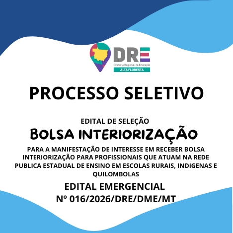 A DIRETORIA REGIONAL DE EDUCAÇÃO, MUNICÍPIO DE ALTA FLORESTA/MT, no uso de suas atribuições legais, considerando a Lei Complementar nº 04 de 15 de outubro de 1990, a Lei Complementar nº 50 de 1° de outubro de 1998, e a necessidade de recompor o quadro de servidores para substituições aos afastamentos legais no município de ALTA FLORESTA/MT, torna público o presente Edital Emergencial, que estabelece as normas e instruções para a realização de Processo Seletivo Simplificado – PSS, PARA CONCESSÃO DE BOLSAS DE INTERIORIZAÇÃO DESTINADAS A PROFISSIONAIS DA REDE PÚBLICA DE EDUCAÇÃO, PARA ATUAÇÃO EM UNIDADES ESCOLARES LOCALIZADAS EM ZONAS RURAIS E INDÍGENAS E