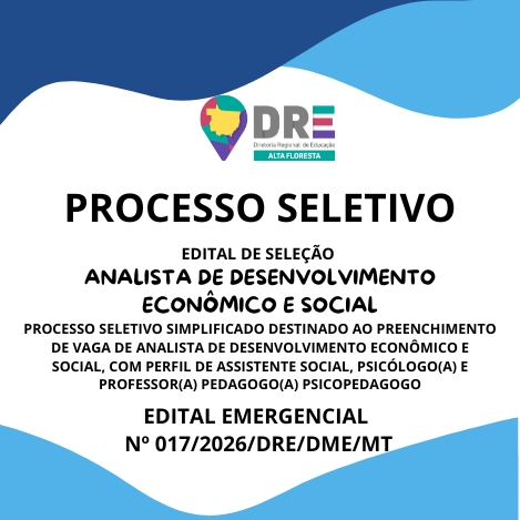 A DIRETORIA REGIONAL DE EDUCAÇÃO, MUNICÍPIO DE ALTA FLORESTA/MT, no uso de suas atribuições legais, considerando a Lei Complementar nº 04 de 15 de outubro de 1990, a Lei Complementar nº 50 de 1° de outubro de 1998, e a necessidade de recompor o quadro de servidores para substituições aos afastamentos legais no município de ALTA FLORESTA/MT, torna público o presente Edital Emergencial, que estabelece as normas e instruções para a realização de Processo Seletivo Simplificado – PSS/2026, destinadas à seleção de profissionais para exercerem o cargo de ANALISTA DE DESENVOLVIMENTO ECONÔMICO E SOCIAL, FUNÇOES: ASSISTENTE SOCIAL, PSICÓLOGO(a) e PROFESSOR(a) PEDAGOGO(a)